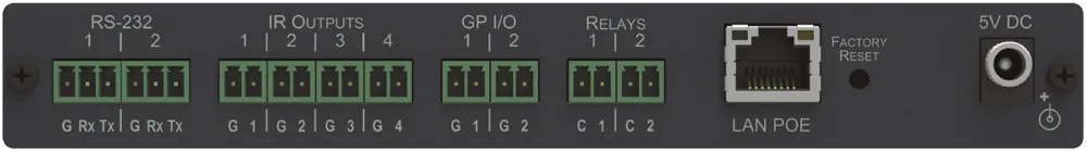 | Прочие разъемы: | RS-232 (2 порта): 3-конт. блоки клемм; Ethernet (1 порт): разъем RJ-45; USB (1 порт): разъем mini-USB, 2 порта GPI/O, 2 реле | |