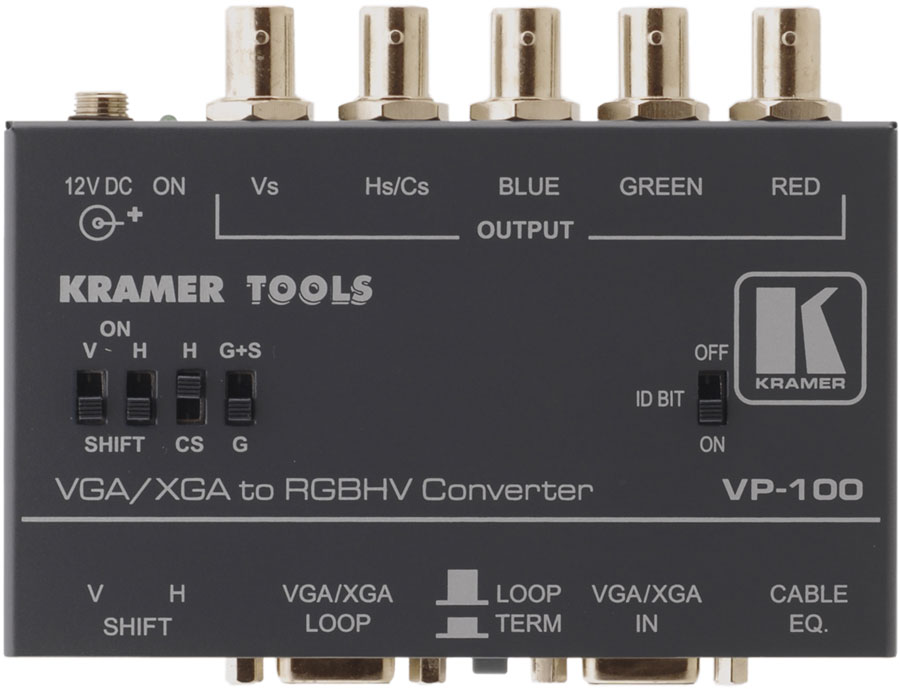 Kramer VP-100 – преобразователь VGA/XGA/UXGA (разъемы BNC) одновременно на локальный и удаленный мониторы. Профессиональные проекторы и большие мониторы чаще оснащаются разъемами BNC, а не разъемами HD15F, которые используются в персональных компьютерах. Преобразователь VP-100 легко решает проблему их совместимости, обеспечивая локальному монитору проходной вход, а также необходимые функции буферизации, усиления и обработки синхросигнала для удаленного приемника. Устройство не работает как преобразователь частоты развертки. Оно может принимать все стандартные графические сигналы (VGA, SVGA, XGA, SXGA и UXGA), обеспечивая на выходе формат RGsB, RGBS или RGBBHV. Благодаря полосе пропускания 350 МГц устройство является полностью прозрачным для сигналов UXGA. Имеется проходное гнездо с включением эквивалентной нагрузки, регуляторы изменения горизонтального и вертикального уровня синхросигнала и кнопка ввода/вывода идентификационных битов. Прибор работает от источника питания 12 В и может применяться во внестудийных условиях. Kramer VP-100 относится к семейству TOOLS – группе компактных высококачественных устройств с оптимальным соотношением «цена-качество» и широким спектром применения.