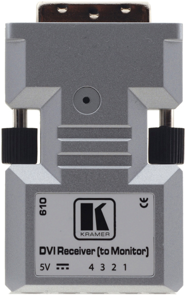 Kramer 610T и 610R — малогабаритные, подключаемые непосредственно к разъему DVI, передатчик и приемник сигнала DVI по волоконно-оптическому каналу. Приборы продаются комплектом.