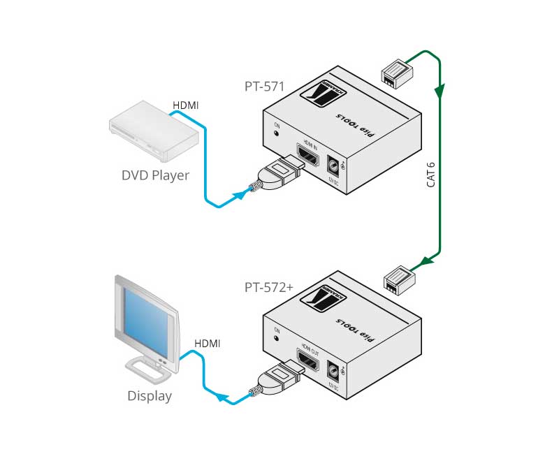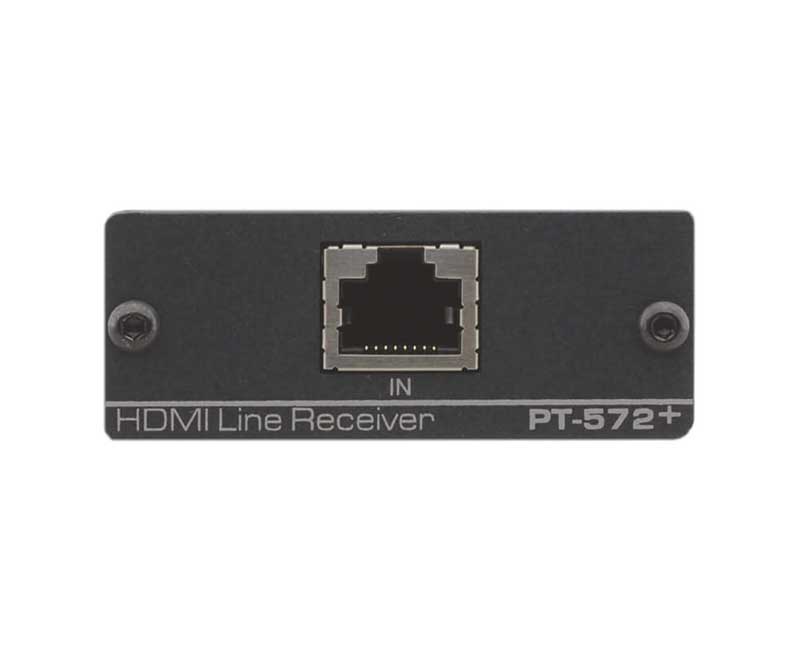 Kramer PT-572+ - приемник сигнала HDMI по кабелю на витой паре. Kramer PT-571 преобразует сигнал HDMI в формат для передачи по кабелю, Kramer PT-572+ выполняет обратное преобразование.