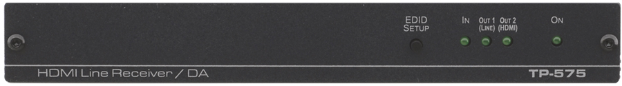 Kramer TP-575 - приемник и линейный усилитель сигнала HDMI, передаваемого по кабелю на витой паре DGKat. Прибор принимает сигнал с витой пары и выдает сигнал HDMI, а также сигнал для дальнейшей передачи по витой паре DGKat.
