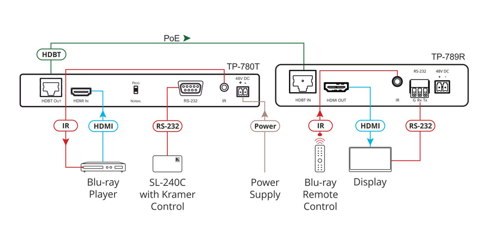 Kramer TP-789R – приемник сигналов HDMI, RS-232 и ИК по кабелю витой пары HDBaseT c поддержкой разрешений до 4K@60 Гц (4:2:0) и функцией двустороннего питания PoE (Power over Ethernet/HDBaseT). TP-789R обеспечивает прием видеосигнала с разрешением 4K@60 Гц (4:2:0), 24 бита на пиксель (8 бит на канал) на расстоянии до 40 м и видеосигнала с разрешением 1080p@60 Гц на расстоянии до 70 м при использовании рекомендованного медного кабеля витой пары производства Kramer Electronics. При использовании кабелей других производителей максимальные значения расстояния передачи могут снижаться.
