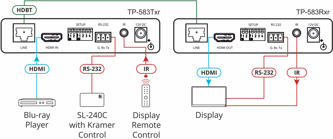 Kramer TP-583Rxr – приемник сигналов HDMI, RS-232 и ИК по кабелю витой пары HDBaseT c увеличенным расстоянием передачи, поддержкой разрешений до 4K@60 Гц (4:4:4) и технологии HDR. TP-583Rxr обеспечивает прием видеосигнала с разрешением до 4K@60 Гц (4:4:4) на расстоянии до 100 м, с разрешением 4K@60 Гц (4:2:0) на расстоянии до 180 м и с разрешением 1080p@60 Гц на расстоянии до 200 м при использовании рекомендованного медного кабеля витой пары производства Kramer Electronics. При использовании кабелей других производителей максимальные значения расстояния передачи могут снижаться.