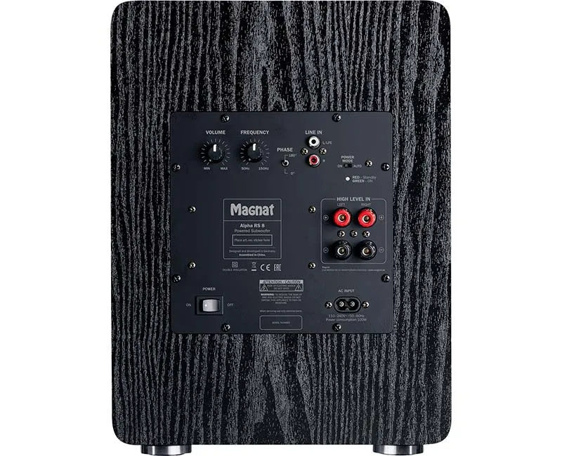 Модель Magnat Alpha RS 8 в корпусе с фазоинвертором и двумя портами Airflex оснащена 200-мм динамиком с длинным ходом диффузора. Встроенный усилитель класса D выдает 80 Вт постоянной мощности с кратковременными пиковыми всплесками до 160 Вт. Сабвуфер RS8 обеспечивает глубокий бас до 25 Гц. Встроенный усилитель позволяет регулировать громкость, частоту разделительного фильтра и фазу для оптимальной адаптации к системе с учетом акустических особенностей помещения.