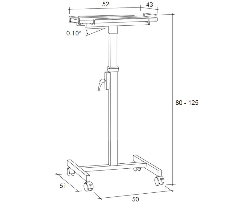 Полка регулируется по высоте 80-125 см и обладает возможностью наклона, делая проецирование более гибким. Благодаря этой функции, можно выбрать необходимый угол наклона исходя из расположения экрана. Дополнительное ограждение на полке защищает проектор от падения, придавая всей конструкции большую надежность. Четыре ролика с покрытием из высокопрочного каучука обеспечивают плавное перемещение столика по любой поверхности. Стойка имеет черное порошковое покрытие, что защищает изделие от ржавчины, коррозии и сколов и продлевает срок службы.