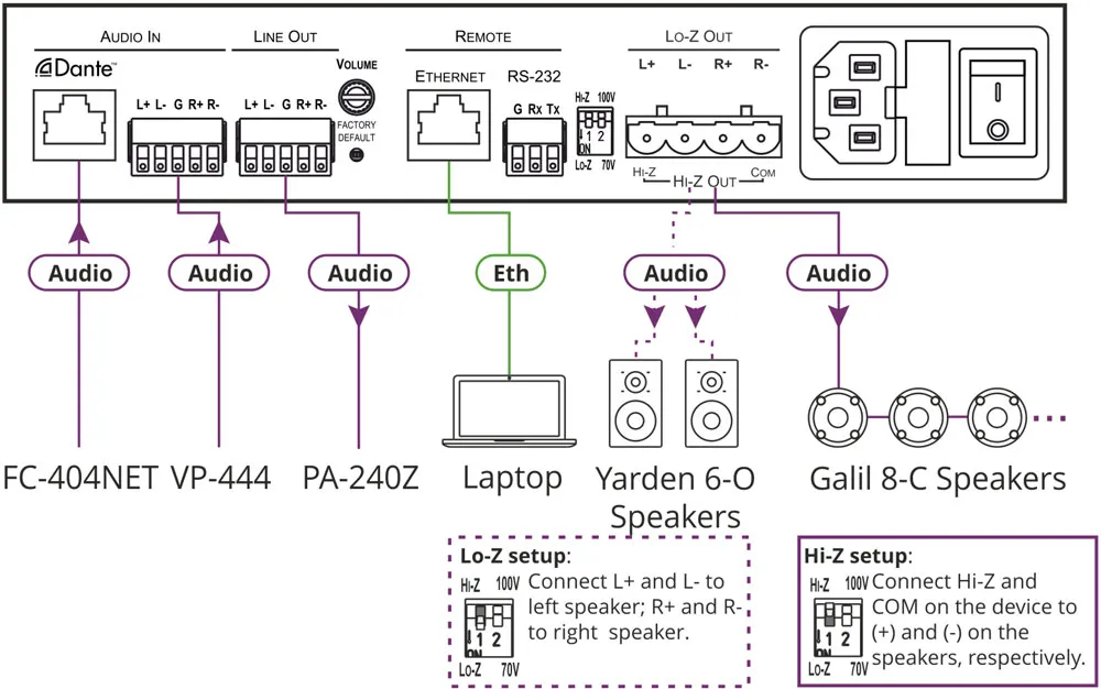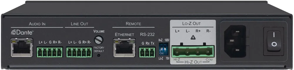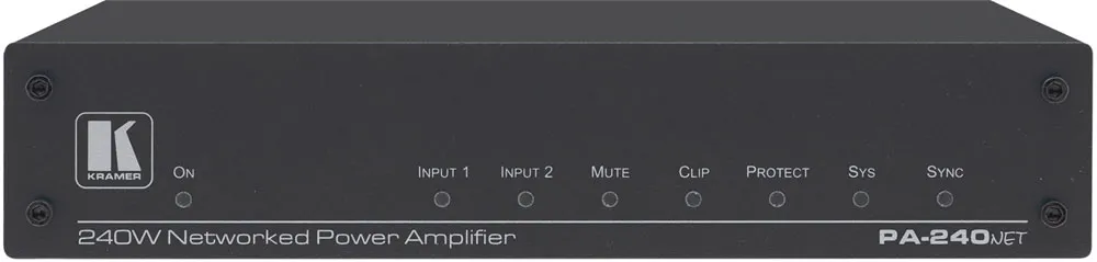 Kramer PA-240Net – усилитель мощности с возможностью работы на низкоомную нагрузку или высоковольтную линию по выбору, имеющий балансный и небалансный входы, дополнительный линейный балансный выход и интерфейс Dante. Усилитель содержит встроенный цифровой процессор аудиосигнала и имеет функцию автоматического перехода в «спящий» режим.