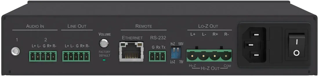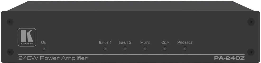 Kramer PA-240Z — универсальный компактный усилитель мощности для высоковольтного или низкоомного подключения с удаленным управлением через сеть Ethernet и двунаправленный интерфейс RS-232. Номинальная выходная мощность 240 Вт при высоковольтном подключении 70/100 В и 2х120 Вт при низкоомном (8 Ом). Прибор имеет балансный и небалансный входы и балансный стереовыход.