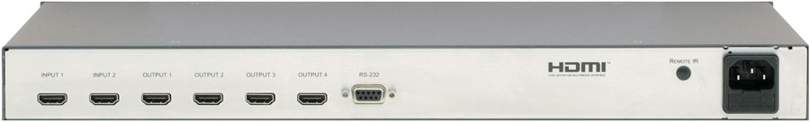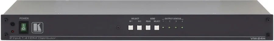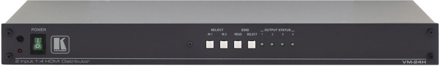 Kramer VM-24H — усилитель-распределитель для сигнала HDMI. Он выполняет компенсацию потерь в кабеле и перетактирование сигналов, поступающих на два входа, и выдает сигнал с одного из них по выбору на четыре одинаковых выхода.