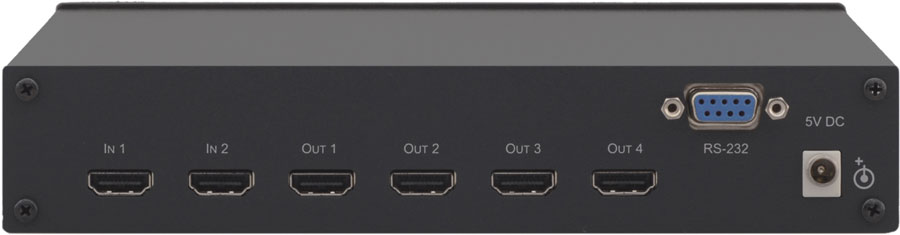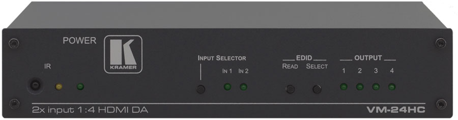 Kramer VM-24HС — усилитель-распределитель для сигнала HDMI. Он выполняет компенсацию потерь в кабеле и перетактирование сигналов, поступающих на два входа, и выдает сигнал с одного из них по выбору на четыре одинаковых выхода.