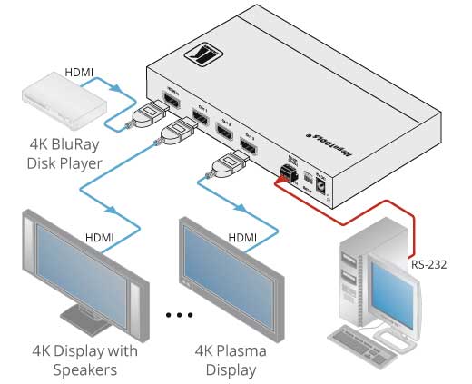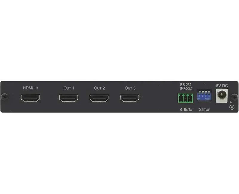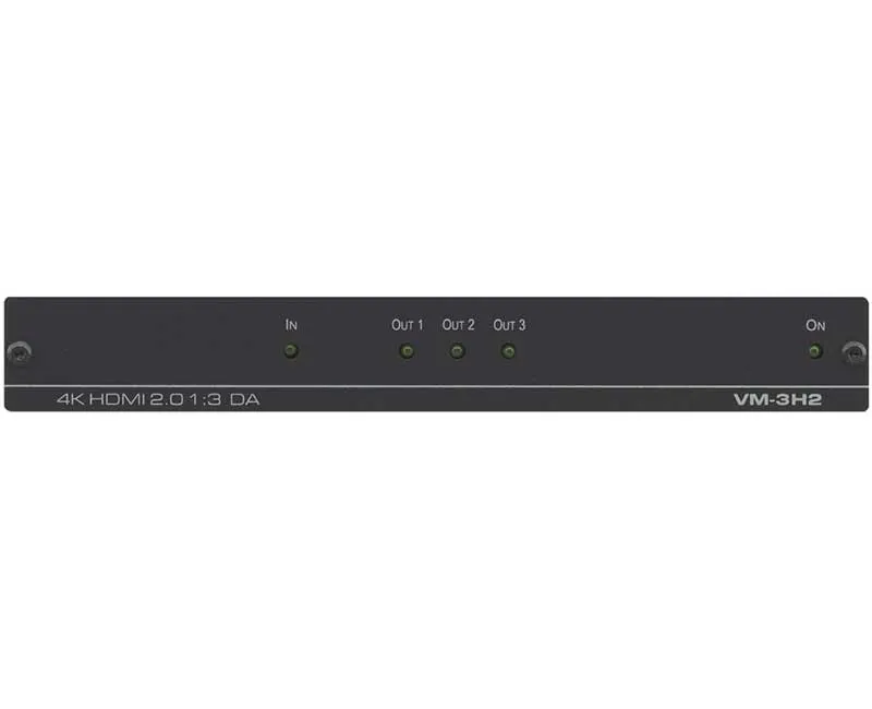 Kramer VM3H2 - усилитель-распределитель 1:3 сигналов HDMI 2.0 с поддержкой разрешения до 4К, 60 Гц, (4:4:4). Прибор производит перетактирование входного сигнала HDMI и компенсацию АЧХ кабеля, после чего распределяет его на три идентичных выхода. VM-3H2 поддерживает HDCP 2.2