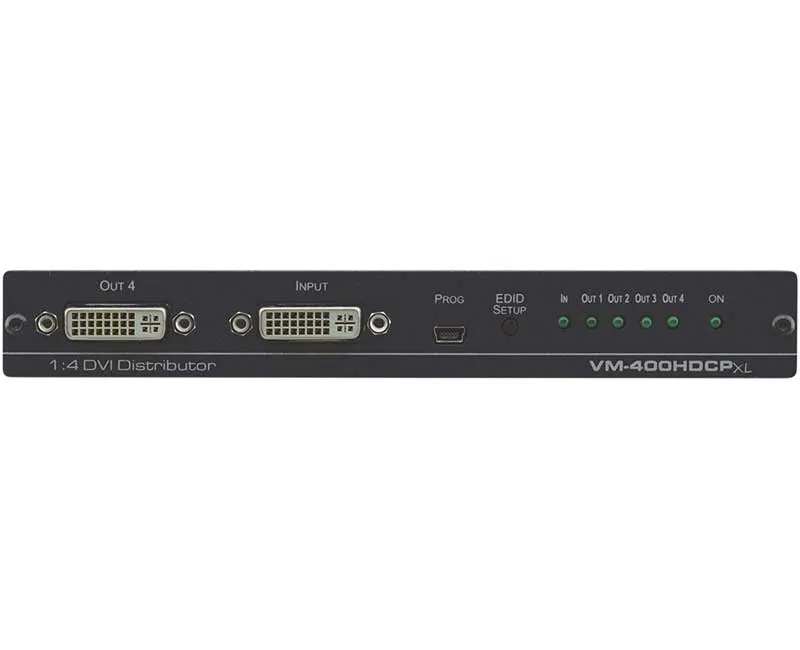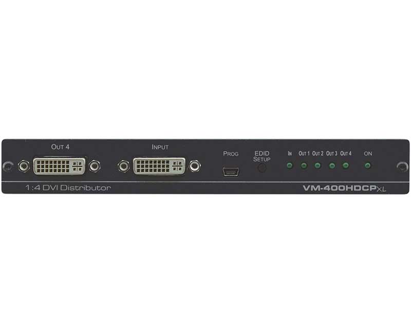 Kramer VM-400HDCPxl — усилитель-распределитель сигналов DVI/HDMI. Прибор поддерживает сигналы разрешением до 4K@60 Гц (4:2:0), выполняет перетактирование и компенсацию АЧХ кабеля, после чего распределяет сигнал на четыре одинаковых выхода DVI (разъем DVI-I).