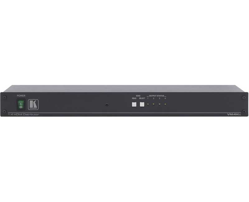 Kramer VM-4Hxl — усилитель-распределитель сигналов HDMI с разрешением до 1080p и WUXGA включительно. Он выполняет перетактирование сигнала и компенсацию АЧХ кабеля, после чего выдает сигнал на четыре одинаковых выхода