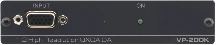 Kramer VP-200K — высококачественный усилитель-распределитель для компьютерных графических сигналов UXGA и более высоких разрешений. Прибор имеет один вход, сигнал с которого после буферизации и развязки распределяется на два идентичных выхода