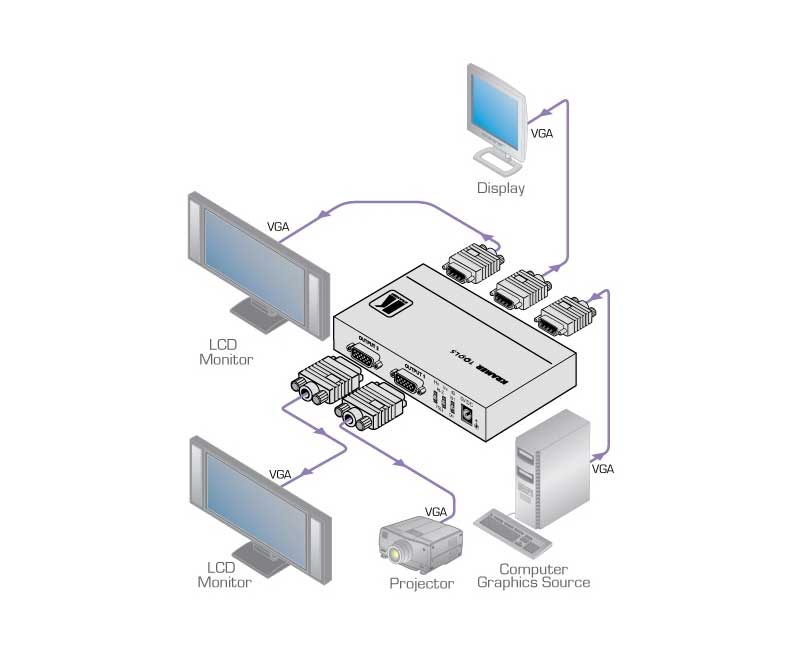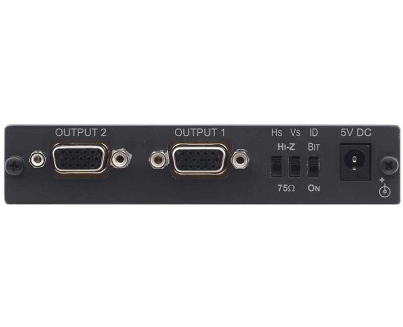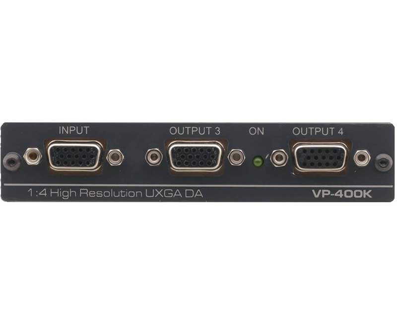 Kramer VP-400K — высококачественный усилитель-распределитель для компьютерных графических сигналов UXGA и более высоких разрешений. Прибор имеет один вход, сигнал с которого после буферизации и развязки распределяется на четыре идентичных выхода