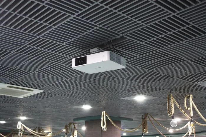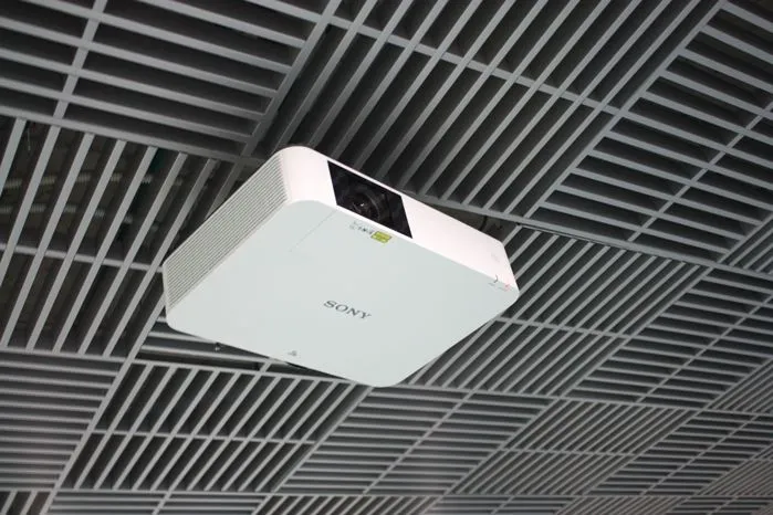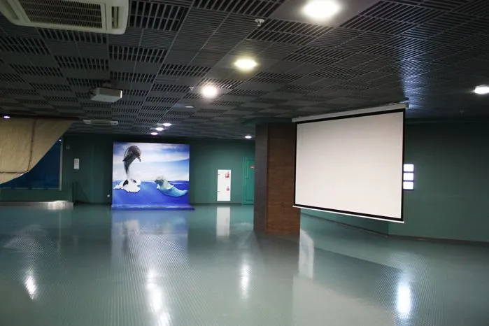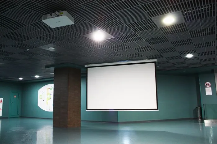 В инсталляции использован яркий проектор с проекционным моторизованным экраном размером 135 дюймов. Высокие яркость и разрешение проектора позволяют просматривать ролики при освещении, а лазерный источник света с ресурсом более 20 000 часов позволяет существенно сэкономить на запасных лампах. Система предусматривает возможность подключение как аналоговых, так и цифровых источников сигнала.